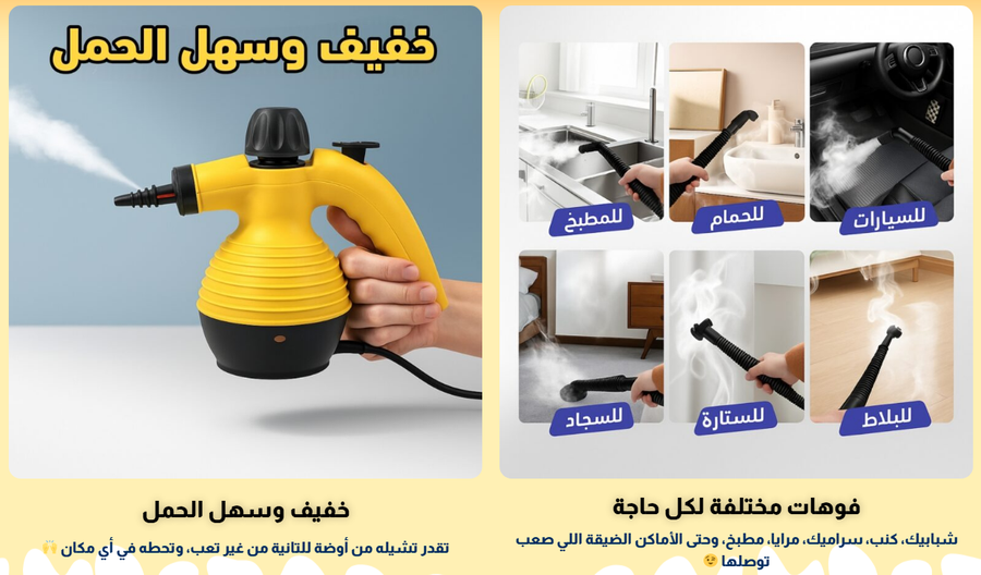 هل تعبت من الأوساخ والدهون العنيدة في المطبخ والحمام؟ جهاز التنظيف بالبخار متعدد الاستخدامات هو الحل السحري لك! بقوة 1000 واط، هذا الجهاز ينظف باستخدام بخار ساخن بدرجة حرارة عالية، مما يجعله مثاليًا لتنظيف جميع أسطح منزلك، من المطبخ إلى الحمام.